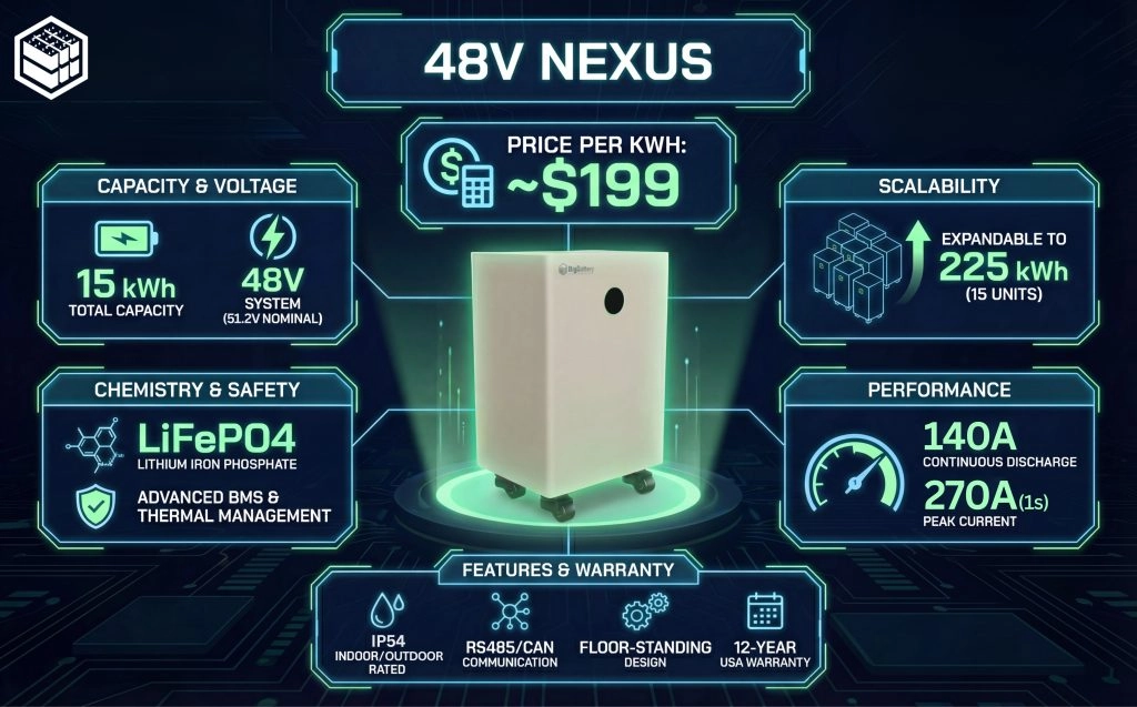 The BigBattery NEXUS™ 48V 15kWh LiFePO₄ Battery is a cost-effective, high-capacity energy storage solution designed for off-grid homes, cabins, and backup power systems. With a compact, portable, floor-standing design, NEXUS delivers reliable, uninterrupted power while allowing flexible installation in garages, utility rooms, cabins, or sheds-without complex mounting.