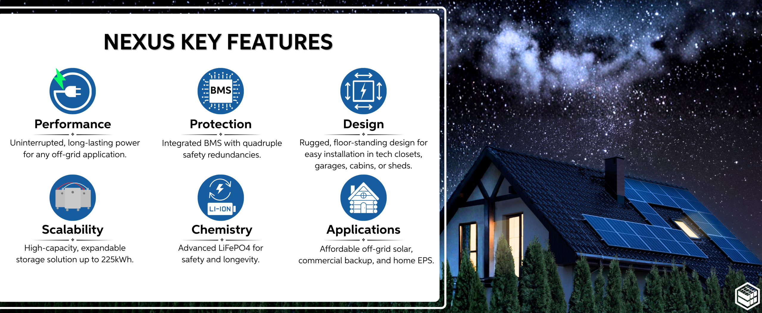 Powered by advanced LiFePO₄ battery chemistry, NEXUS offers long service life, enhanced safety, and consistent performance. Built with an integrated Battery Management System (BMS) featuring multiple layers of protection, it ensures dependable operation even in demanding environments.