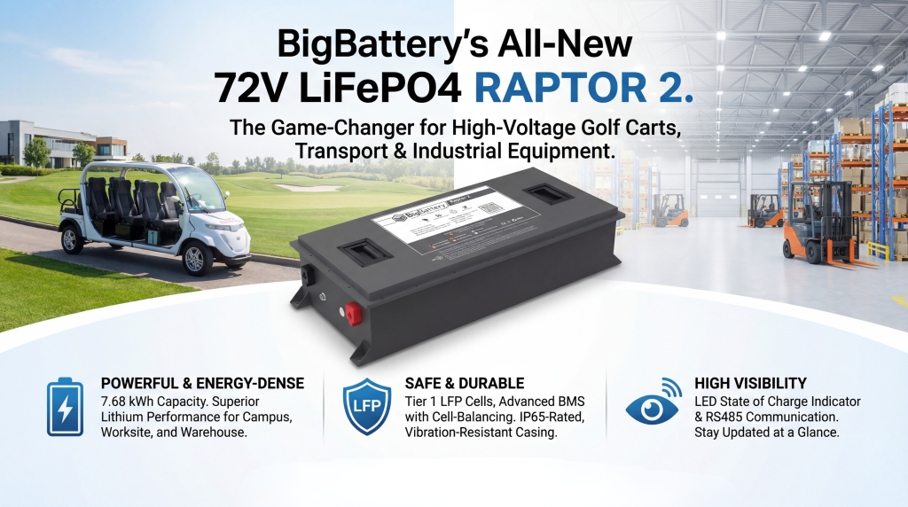 The 72V RAPTOR 2 – 7.68 kWh LiFePO₄ Battery is a high-voltage lithium power solution engineered for golf carts, transport vehicles, and industrial equipment. Delivering 7.68 kWh of energy in a compact, energy-dense design, the RAPTOR 2 provides strong, consistent performance for demanding applications where higher voltage systems are required.